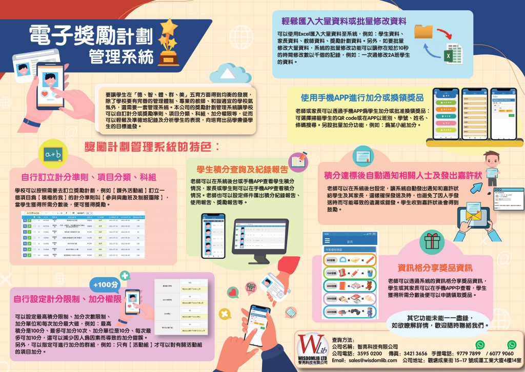 要讓學生在「德、智、體、群、美」五育方面得到均衡的發展,除了學校要有完善的管理體制、專業的教師、和諧適宜的學校氣氛外,還需要一套管理系統。本公司的奬勵計劃管理系統讓學校可以自訂計分或奬勵準則、項目分類、科組、加分權限等,從而可以輕鬆及準確地記錄及分析學生的表現,向培育出品學兼優學生的目標進發。